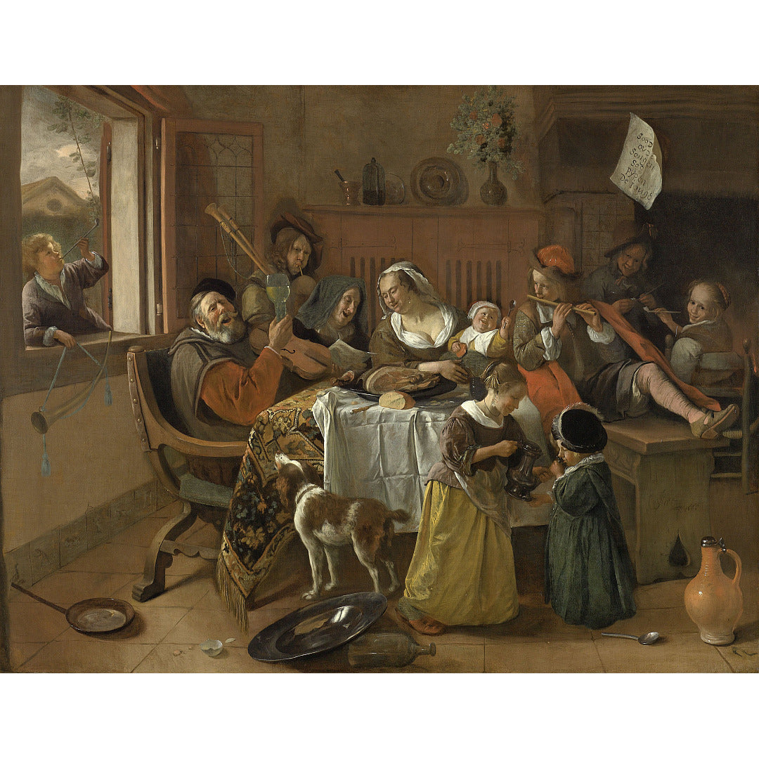 Many of Steen's paintings bear references to old Dutch proverbs or literature. His cheerful paintings of disorderly families gave rise to the Dutch proverb, “a Jan Steen household” (een huishouden van Jan Steen).
